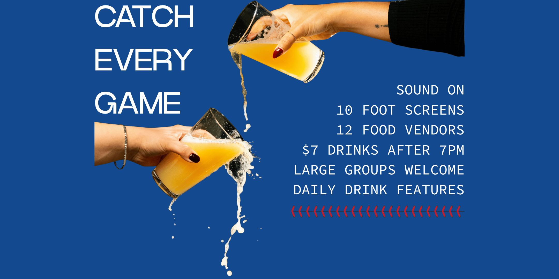 Bring your friends and watch every game on our 10 ft screens with the sound ON! Over 12 food vendors to choose from, daily drink features, and $7 drinks after 7 pm. Book a table to secure your spot!