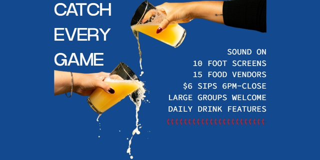 Bring your friends and watch every game on our 10 ft screens! Over 15 food vendors to choose from, daily drink features, and $6 Sips every day. Book a table to secure your spot!
